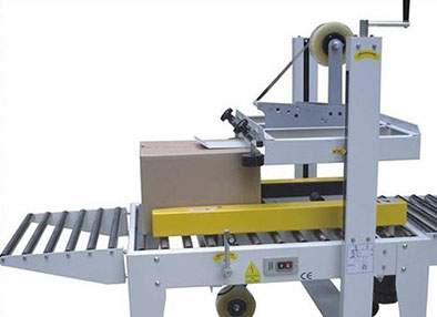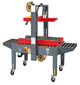 El alto y ancho de la máquina se puede ajustar al tamaño de la caja. Posee un sistema de desplazamiento sobre ruedas con freno, y permite cerrar hasta 900 cajas por hora.